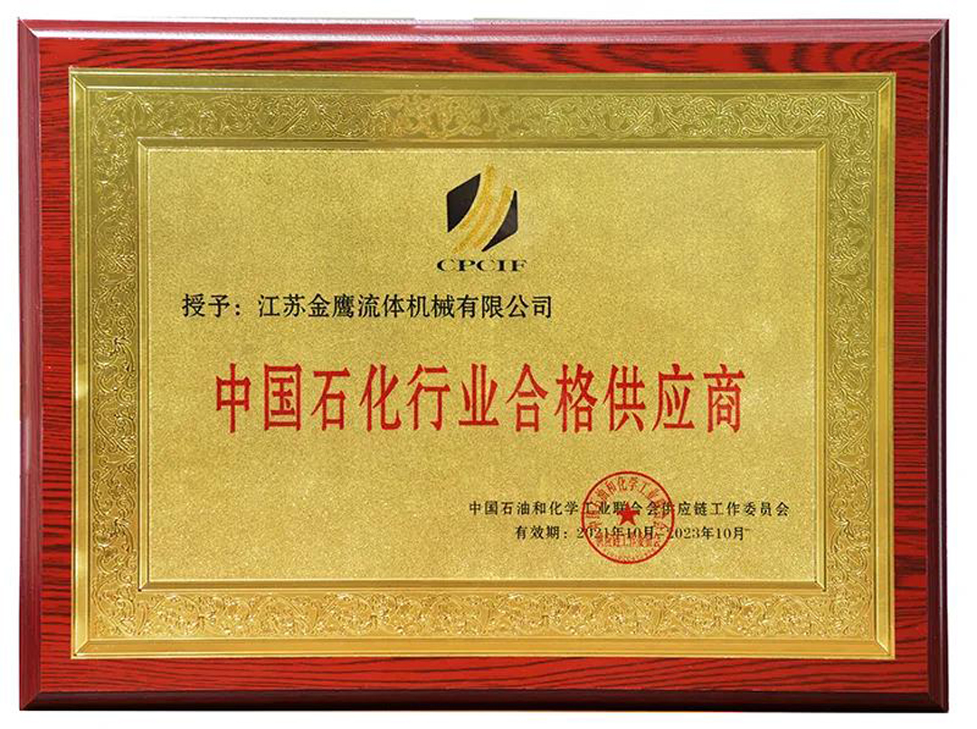 江蘇金鷹流體機(jī)械有限公司榮獲了由中國(guó)石油和化學(xué)工業(yè)聯(lián)合會(huì)供應(yīng)商鏈工作委員會(huì)頒布的《中國(guó)石化行業(yè)合格供應(yīng)商》證。